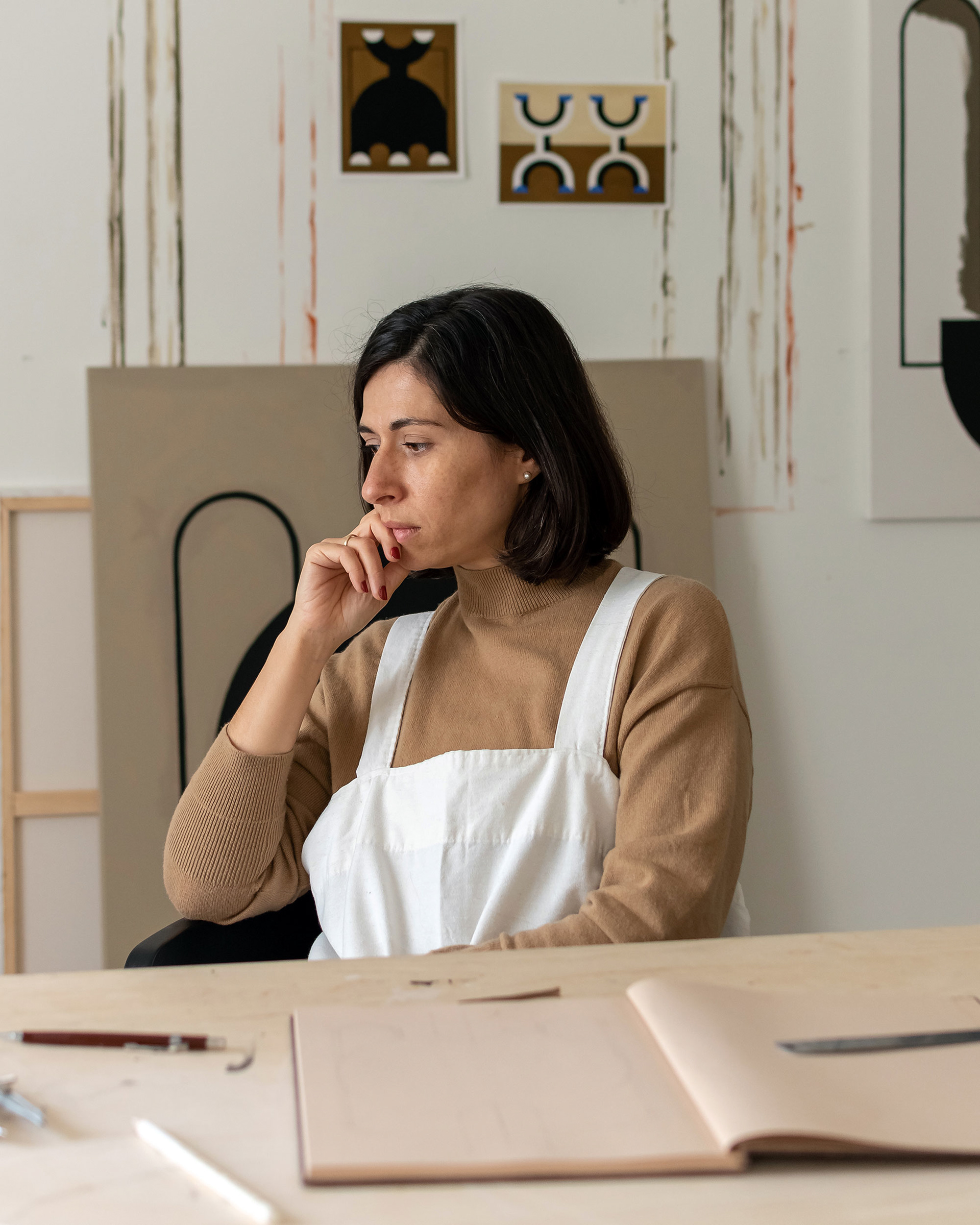 Eleni Psyllaki (Greek, b. 1981) was originally trained as an architect and it’s her background in architecture and design which informs her art practice. Her paintings and works on paper are characterised by linear sketching, straight lines, scaling and above all a love for symmetry. The strict geometry and precision of her works is a continuation of the free sketching one comes across in architectural drawings. Her color palette is infused with balanced earthly tones inspired by her birth place Crete. In her paintings we can discern the beige of stone, the brown of tree trunks, the olives' khaki and the gold of summer cobs. Her forms on the other hand are strict and minimal and rooted in abstraction where any surplus information or detail is eliminated infusing the works with a Doric quality. In this way, Psyllaki likes to draw the attention to the contours, hard edges and pure tonality of the form.